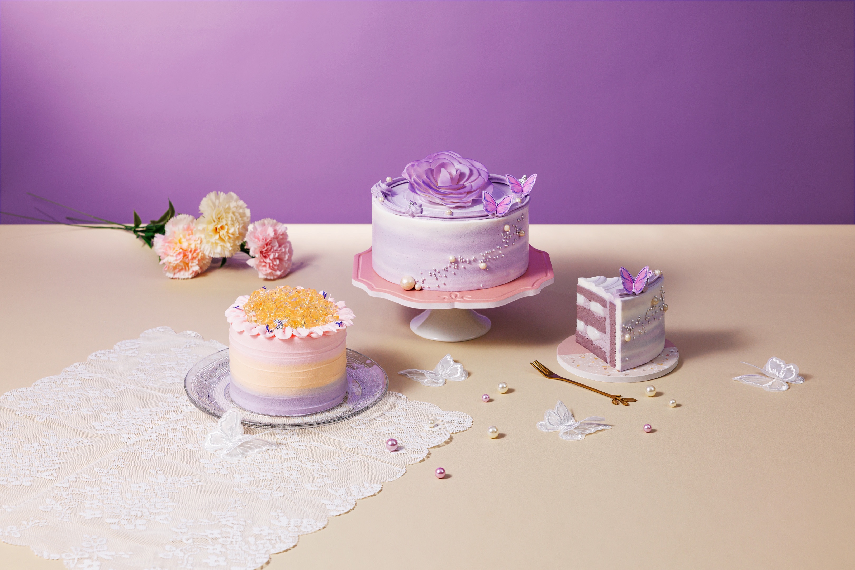 「心之瑰寶- 紅桑子荔枝蛋糕」$398 起;「愛如繁星 – 紅桑子開心果蛋糕」$428 起