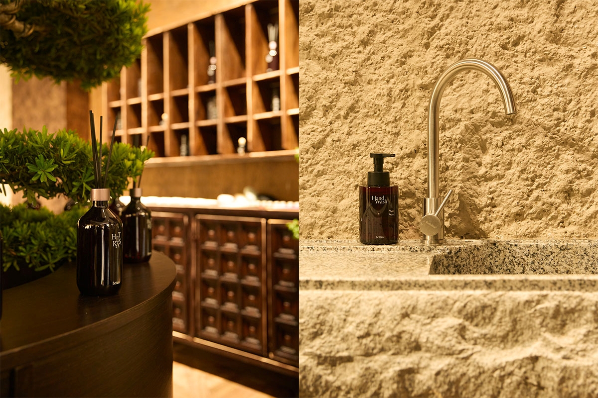 全新品牌空間選址銅鑼灣最繁華的核心地段,空間設計卻以韓式極簡美學反其道而行,讓人感受到舒逸如家的氛圍;香氣彌漫的空間以木材、啞光石材與磨砂玻璃組構,配合溫暖燈光點綴,營造出靜謐放鬆的感官空間。空間高度還原韓國聖水洞、明洞與安國店的設計,既具細緻的拍照場景,也鼓勵客人於柔和光線與香氣中「放慢」。